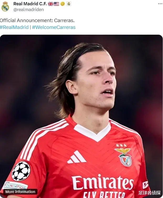 官方:皇马宣布从本菲卡签下了阿尔瓦罗-费尔南德斯-卡雷拉斯(简称A费),双方签署了一份2031年到期的6年合同。