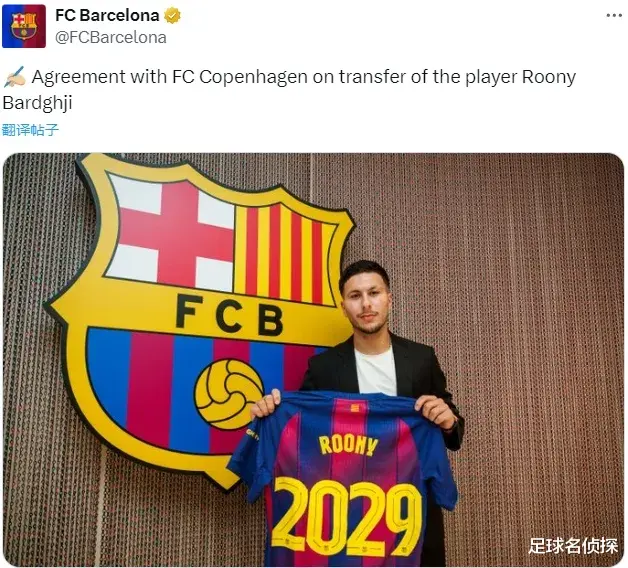 官方:巴萨宣布和哥本哈根就鲁尼-巴尔德吉的转会达成了协议,这名19岁的新星签下了一份4年合同。