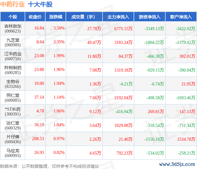 个股表现方面,中药行业当日领涨股为吉林敖东(000623),该股当日报收16.84,上涨3.5%,成交量27.78万,主力资金净流入6771.15万元。九芝堂(000989)以上涨3.35%紧随其后,该股当日成交量49.47万,主力资金净流入3183.24万元。除此之外,江中药业(600750)、羚锐制药(600285)、生物谷(833266)均进入当日牛股之列。具体个股列表见下表: